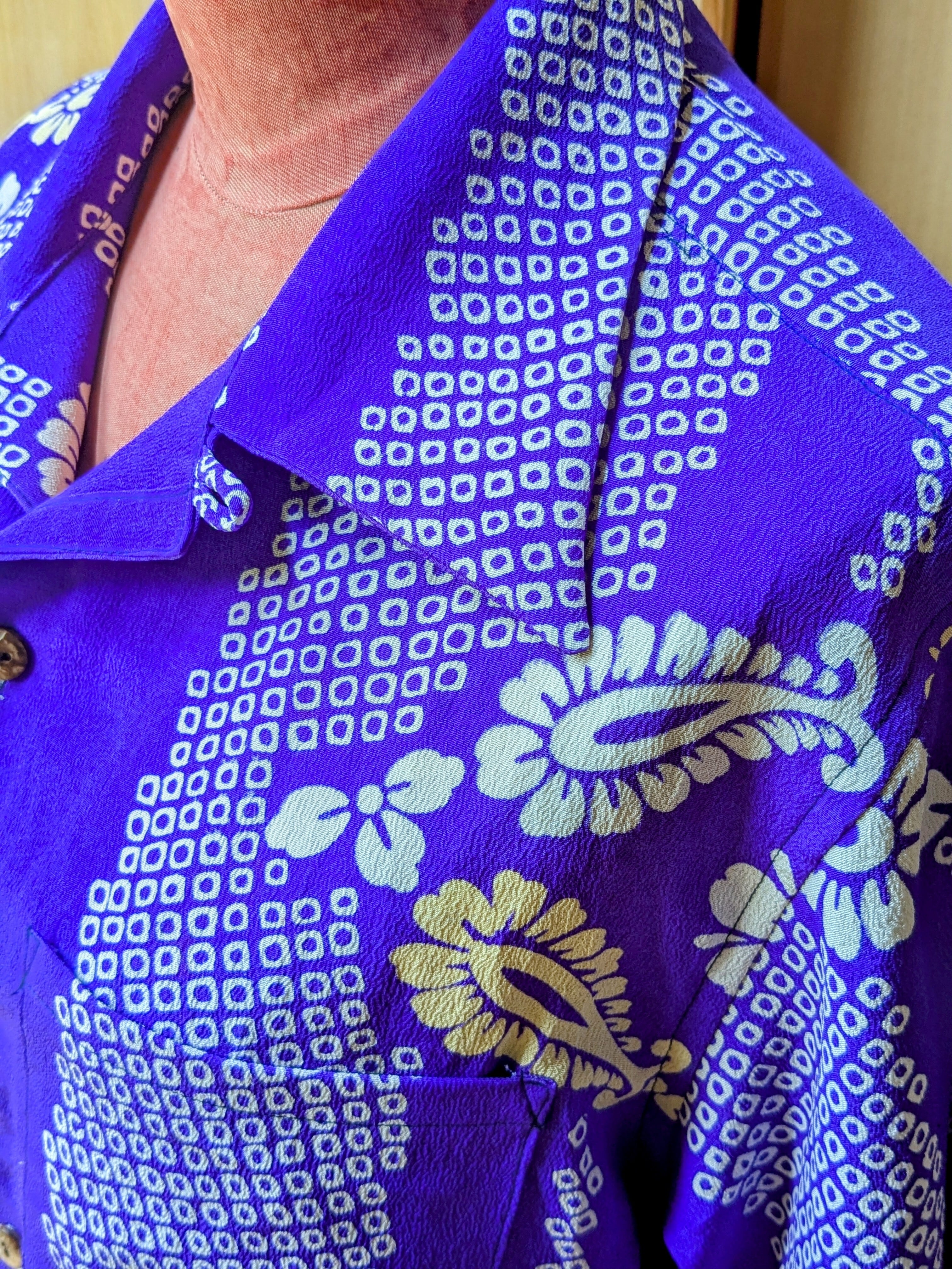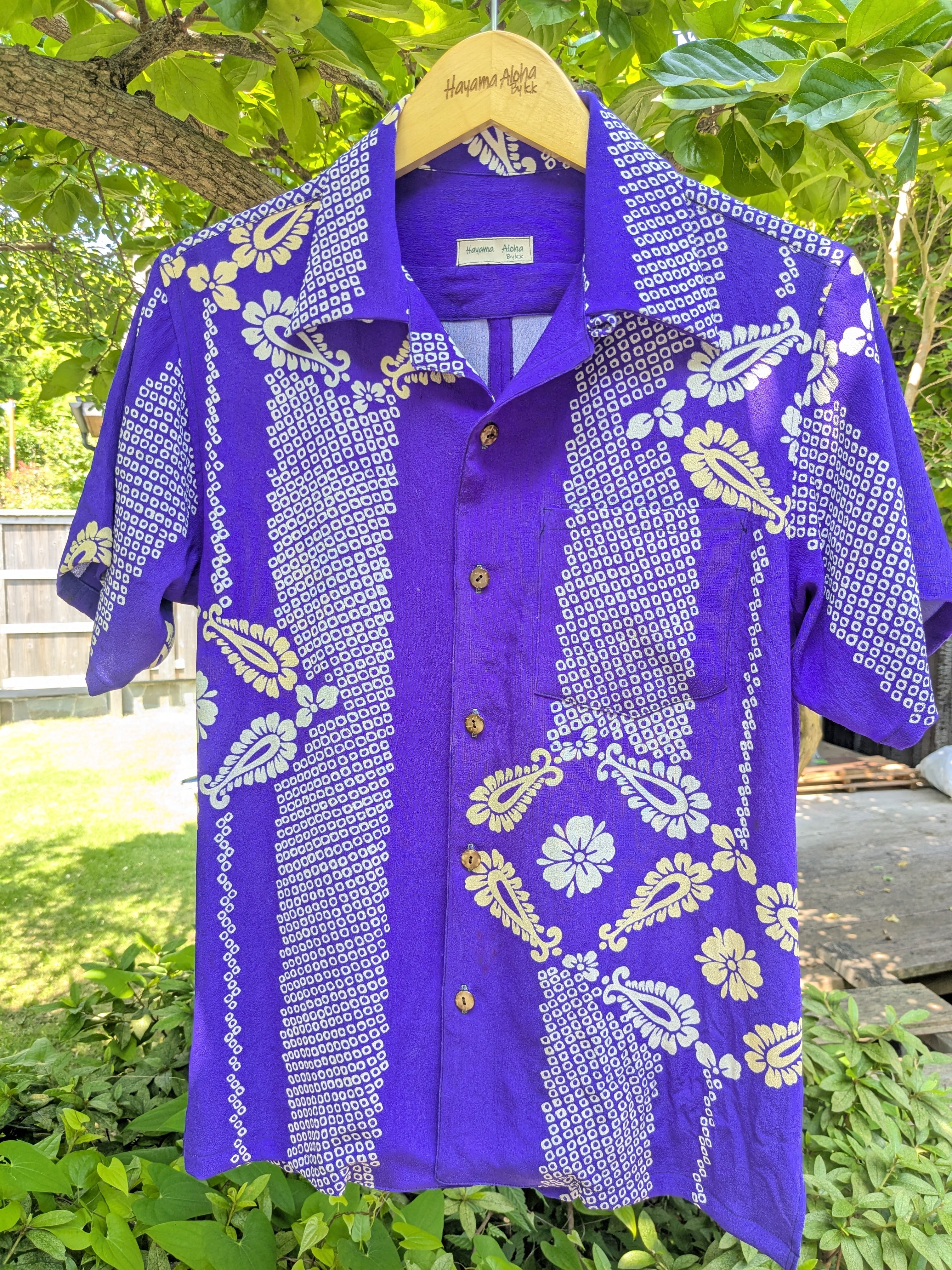 色と紋様の組合せがエキゾチックな印象が強いアロハシャツです