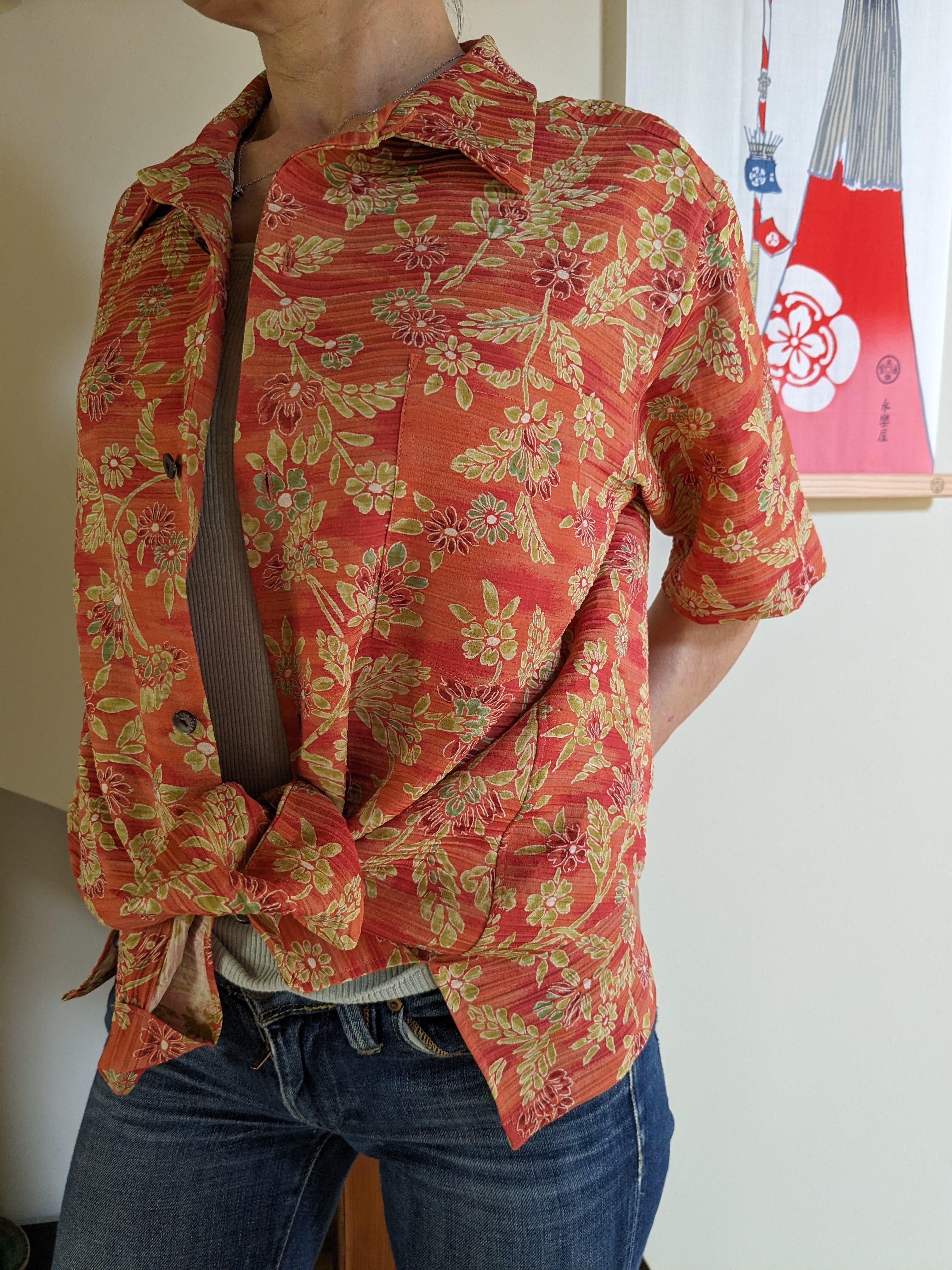 日本伝統技術の京染の繊細な柄が、アロハシャツになる事で改めて新鮮な柄として生きてきます。